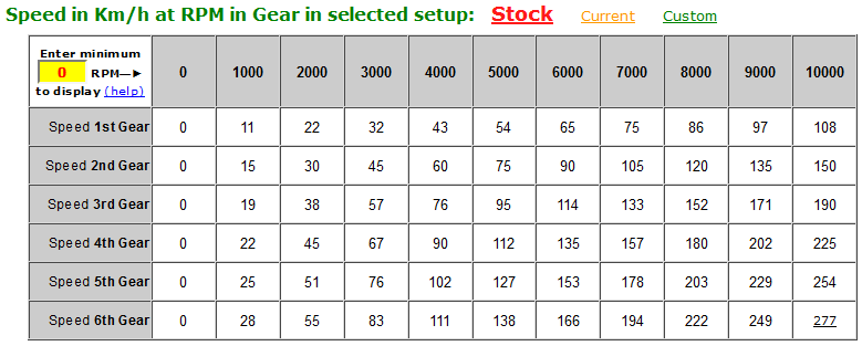in Km/h at RPM in Gear in selected setup: Stock Current Custom " you can read your