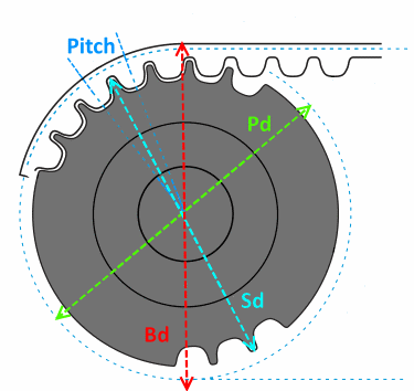 Pd = Pitch Diameter (bigger as actual sprocket diameter Sd) To check if this sprocket with belt will fit you need to check for the Belt diameter (Bd) as that is biggest one.